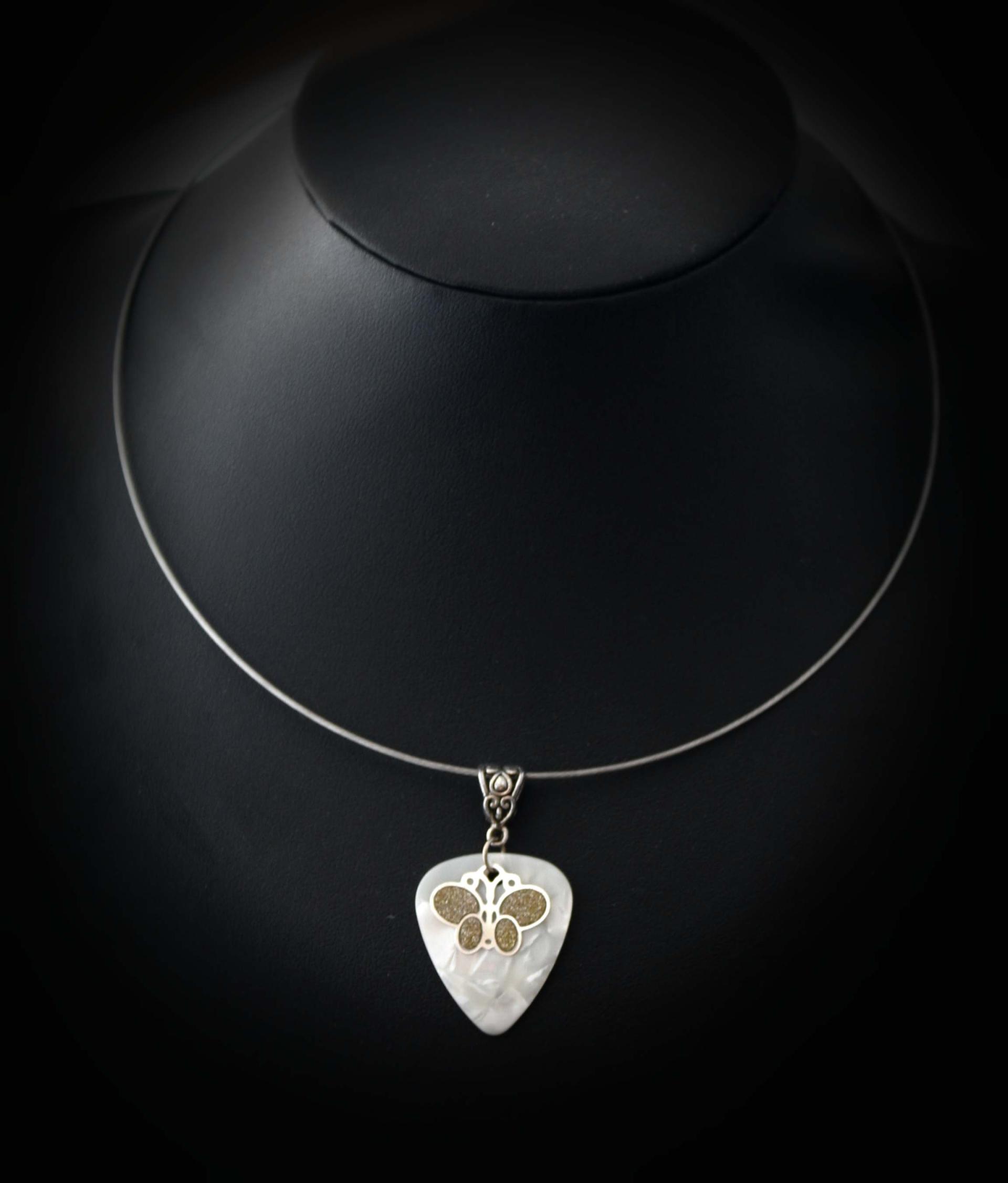 For our musicians and butterfly lovers, Chrissie C has utilised her love of music and nature and crafted a fabulous quality stainless steel 2 tone butterfly charm onto a pearl design guitar pick.