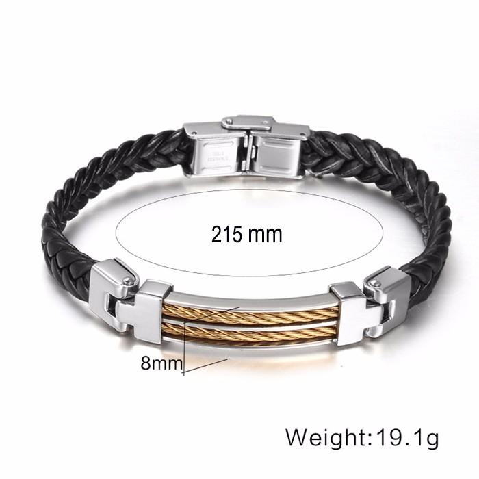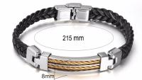 This is a unique design leather and steel bracelet featuring a gold coloured "rope chain" inlay in the styling.